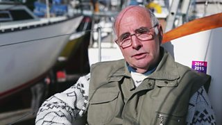 A pensioner clings to a mooring rope for dear life after falling from a boat.