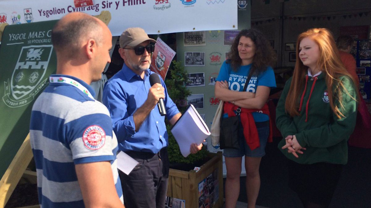 Cyfle i ymateb i bynciau'r dydd yn Eisteddfod Genedlaethol yr Urdd Sir y Fflint. A chance to react to the day's topics at the Urdd National Eisteddfod.