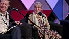 Shappi Khorsandi and Gillian Clarke on stage in the BBC's Big Blue Tent at the Edinburgh Festival