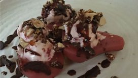 Raspberry poached pear, raspberry cream, chocolate sauce and candied hazelnuts