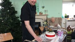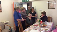 Mae Nia Lloyd Jones yn dathlu'r Nadolig yng nghwmni preswylwyr cartref Plas Pengwaith. Nia Lloyd Jones celebrates Christmas with the residents of Plas Pengwaith Residential Home.