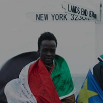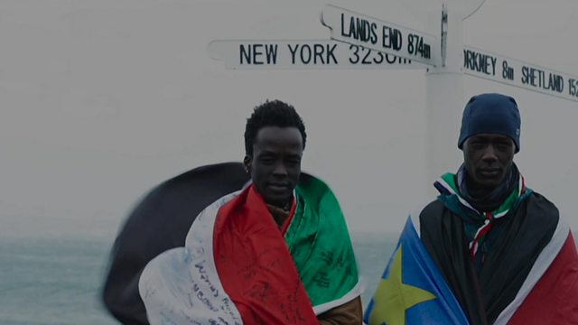 Two former child refugees to UK complete marathon across the length of Britain to draw attention to war in Sudan.