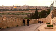 The Mount of Olives is to the East of Jerusalem and is believed to be where Jesus entered Jerusalem on a donkey. To find out exactly what happened in this place, Aled and our choir travel the same route Jesus would have travelled. They are joined by Helen Bond, Professor of Christian Origins at Edinburgh University. They arrive at Dominus Flevit Church, where Helen reveals the story of Palm Sunday.