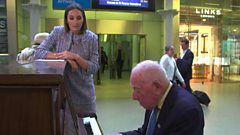 91 years old Denis Robinson entertains passers by at St Pancras Station by playing hymns on the piano in the station concourse.