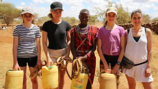 The girls' team and presenter Camille meet Kenyan wildlife and learn spear throwing.