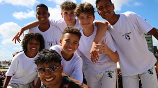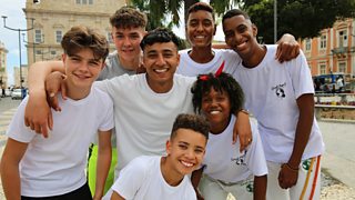 The boys' team and presenter Karim are in Brazil to learn the martial art capoeira.