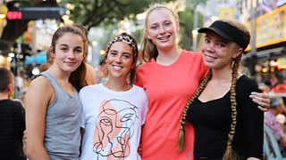 The girls' team and presenter Camille are in Malaysia learning the sport of lion dancing.