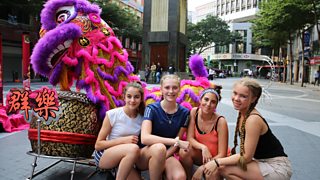 The girls' team and presenter Camille are in Malaysia learning the sport of lion dancing.