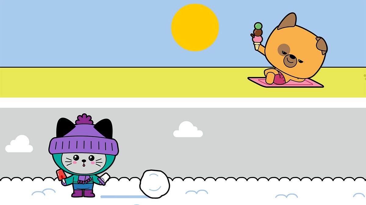 Kit and Pup explore the opposites melting and freezing. Pup is at the beach with a melting ice cream and Kit is in the snow with a frozen ice lolly. Kit and Pup then try and find as many melting and freezing objects as they can. In the live action investigation, Kit and Pup help a little investigator discover which objects will melt and which will stay the same. And in the stop motion moment, an ice cream slowly melts onto a table.