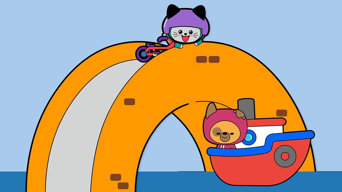 Kit and Pup are exploring the opposites over and under. Kit starts by going over a bridge on a bike whilst Pup goes under the bridge on a boat. Kit and Pup then try and find as many examples of things travelling over and under as they can. In the live action investigation, Kit and Pup help the little investigators pass toys over and under to get from one side of the room to the other. And in the stop motion moment, a dolphin swims under and then jumps over a boat.