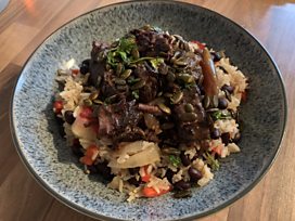 Slow cooked shin of Beef with Fairtrade coffee & Smoked Chilli, Rice & Black Beans, Toasted Pepitas