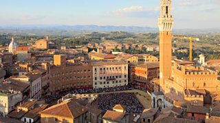 2/5The author and his wife visit Siena's town hall to see the famous frescoes.