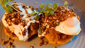 Carrot and Potato Cakes, Carrot Jam, Fried Egg, Onion Yoghurt & Smoky Seeds
