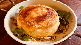 Twice baked goat cheese soufflés, with honey candied walnut and honey dressing.