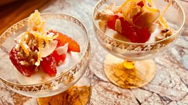 Blood orange cheesecake cream with almond and white chocolate crumble, candied orange