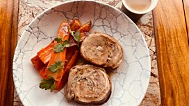 Salami stuffed breast of lamb with braised carrots and rosemary gravy