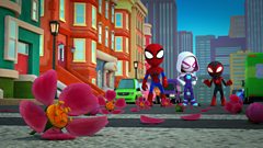 Spidey, Spin and Ghost-Spider team up with other superheroes to fight evil foes.