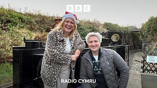 Ifan Jones Evans a Ffion Emyr â rhaglen Nadoligaidd arbennig ar drên bach Cwm Rheidol.
