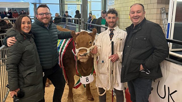 A Megan Williams sy'n crynhoi'r canlyniadau o gylch y gwartheg, gyda sylwebydd y cylch, Meurig James. Sgyrsiau hefyd gyda phencampwyr y sioe, Cai a Gwyn Edwards o Fetws Gwerfyl Goch, a Kathryn Jones o Frechfa, brynodd brif bencampwr y Ffair Aeaf am £27,000.