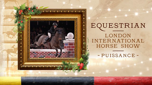 Live coverage of the Puissance, a classic equestrian high-jumping event where riders and horses jump over a series of obstacles - including a progressively higher 'big red wall' with the highest successful jumper winning - at the London International Horse Show.