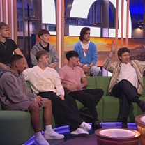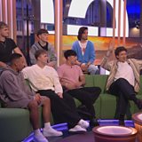 Jason Watkins, Greg James and boy band December 10 join Alex Jones and Roman Kemp on the sofa.