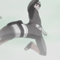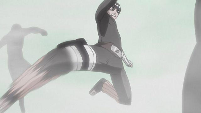 Raiga and Ranmaru use their Hidden Mist jutsu to conceal themselves in Katabami Gold Mine, where even Neji’s Byakugan cannot detect them. Naruto, Lee, Neji and Tenten are blown unconscious with Raiga’s jutsu. Just as Raiga is about to deliver the finishing blow, Lee gets him with a swift kick!