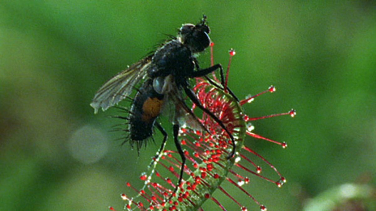 The hairs on each leaf of a sundew plant are tipped with a sweet, sticky glue which provides and attractive feast for insects. Stuck in the glue, visitors soon become prisoners of the plant. The nutrient poor soils of the bogs force sundews to extract energy in this way and they need to catch up to 2,000 insects in a summer to survive.