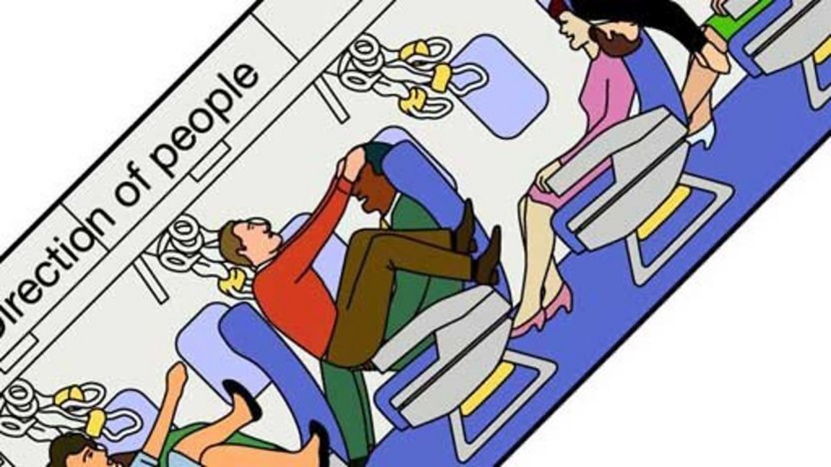 Airline safety card characters come to life and try to cope with the demands of an emergency situation.