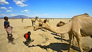 In the north of Africa's Great Rift Valley lies an extraordinary desert, unlike anywhere else on Earth. The cradle of mankind and home to our earliest ancestors, the Danakil Desert in Ethiopia is one of the most geologically active places on the planet. Volcanoes and earthquakes rip apart the ground in front of your very eyes. And it's officially the hottest place on Earth. Within this remote furnace temperatures can hit 60 degrees Celsius (145 degrees Fahrenheit), and there is almost no water. It should be devoid of life, but it's not. Somehow people live here - a legendarily tough, nomadic warrior tribe called the Afar.