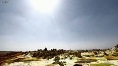 Up to 2,000 camels a day travel to the salt mines, and it is so hot that the journey can only be done 6 months of the year. Steve looks at camel droppings, and talks about how the camel can save water by absorbing water in their colon and making dry droppings. Kate and Steve look at the skeleton of a dead camel as Steve wryly comments, this is probably the worst case of dehydration they're likely to see. Scavengers - probably vultures - have eaten almost everything.