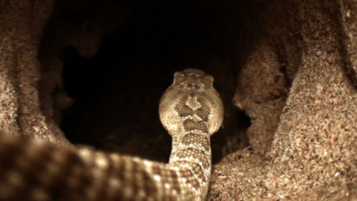 A prairie rattlesnake is taking a slither through prairie dog town on the look out for a burrow to rest in and perhaps even a snack. The prairie dog pups have been resting in their burrow during the heat of the day, but when there are snakes about it's not the best time to take a nap. The alarm calls begin on the surface and most of the young pups make their getaway before it's too late, but any stragglers left in the burrow are in real danger. However the elaborate burrow system means they have more than one way in and out, so it's a cool last minute getaway for the young prairie dog pup.