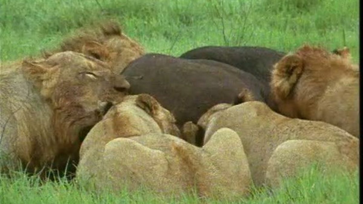Lions live in groups known as prides, with lionesses at the core. There may be a dozen or so females all closely related, mothers and daughters, sisters and aunts, it is these lionesses that do most of the hunting. Two or three males, often brothers, will have fought as a team to drive off their predecessors to take over the pride, and they will fight again if newcomers try to displace them. For lions, living in groups brings several advantages, it enables them to tackle large, powerful prey such as buffalo. These huge animals are three times the weight of a lion and a single hunter would be very unlikely to tackle a healthy adult buffalo alone. But a pride, by working together, has a chance, the preliminary chase serves to get the measure of the quarry and to isolate an individual. If one buffalo seems weaker than the rest, it will become the target of the lions attack. Despite the numbers pinning it down, the buffalo is still dangerous until it is finally killed, and the feasting begins. There's little squabbling or fighting in the pride when they begin to feed, a hierarchical structure allows those who haven't got a place at the carcass to amiably await their turn. Only in very hard times, when the pride is extremely hungry will issues of priority be settled by fighting. A lion pride will dominate the harsh and ruthless world of the African plains, the secret of that success is in their co-operation. This co-operation even extends into other parts of their lives, the lionesses nurture their cubs as a team, taking turns to guard them and on occasion suckling one another's infants.