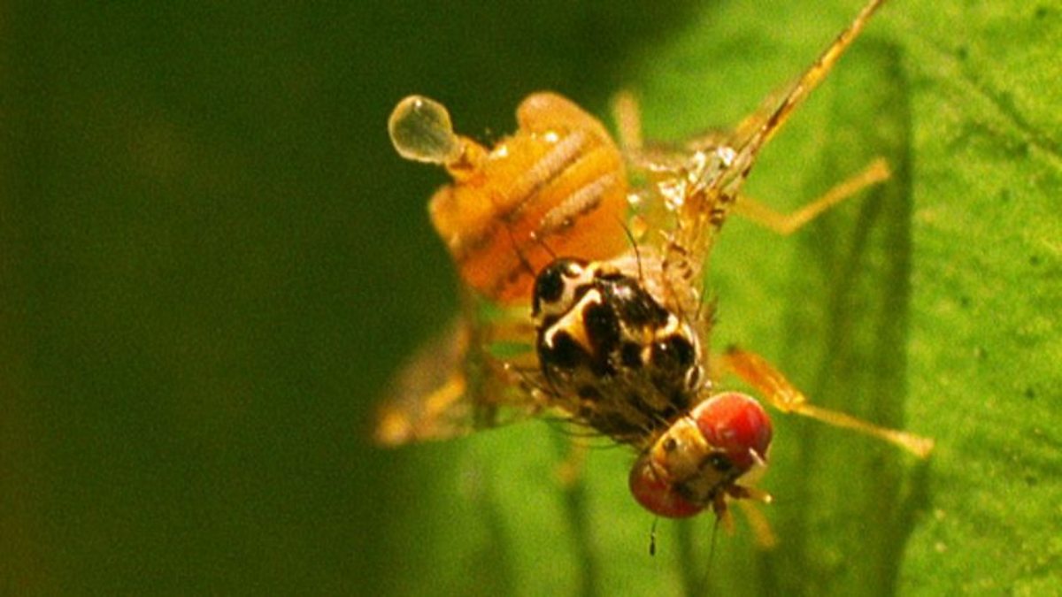 In the dense foliage of a Greek orange grove, male fruit flies advertise at their peril. These tiny suitors are Mediterranean fruit flies: the females are pests that inject their eggs into citrus fruit and the developing larvae destroy them. Gathered in full view on the leaves, each male produces a droplet of scent from his rear. This is an aphrodisiac to lure the females in. Broadcasting with their bottoms, the males signal their availability and their exact position in the dense foliage. This aerial scent trail can be detected several hundred metres away and quickly attracts customers. The arrival of the female causes an outbreak of vigorous wing fanning as the males try to waft a stream of perfume her way. If she likes what she ‘smells’, she approaches the source and her presence sends the male into a frenzy. Her staunch attendance to his performance signals that he may proceed to the sexual finale. But such obtrusive behaviour has its dangers. There are other customers on the wing! Predatory wasps have learned to home in on the male fruit fly’s alluring scent. Couples preoccupied with mating are easy prey. The dismembered victims are taken back to the wasp’s nest.