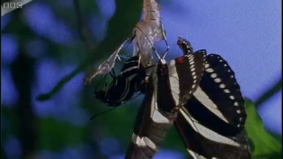 Some male butterflies have taken the sexual arms race one step further. This Latin American zebra wing can smell out females even before they hatch. There’s a female inside this chrysalis and he wants her. While he waits for her to hatch, the male sprays an aerosol of obnoxious chemicals which puts other males off her scent. But just in case, he guards her, to make sure that no one else wins this prize. He’ll not have long to wait. As she struggles free, and even before she inflates her wings, he forces her to mate with him. Like the damselfly, the male holds on to the female with special claspers. And his penis is uniquely shaped to fit only females of his own kind. Safe in the knowledge that his chemical suppressant will ward off rival males, he takes his time to transfer his sperm, so ensuring that he is the sole father of her offspring.