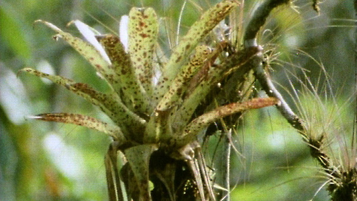 The spores of ferns and mosses lodge and germinate in the crevices of tree bark on rainforest trees, covering them with lush growth. These later form pockets of compost in which orchids and bromeliads grow. Bromeliads are related to the pineapple and each has its own population of animal lodgers. Various animals make use of the bromeliads' leaves to shelter in and the pools of water trapped at their heart are frequented as a useful drinking spot for canopy animals. Several species of poison arrow frogs use the pools in bromeliads as tadpole nurseries. Most regard their parental responsibility as over once they've dropped their tadpoles in the pool. But one species returns to lay more eggs in the pool, but these aren't fertilised - they're merely a food for the existing tadpoles.