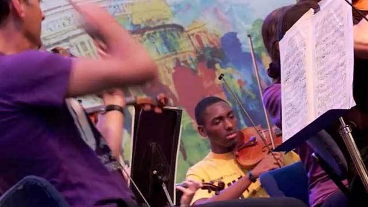 The BBC Symphony Orchestra and Young Musicians play Elgar's Pomp & Circumstance March No.1 at Westfield Centre in West London as part of the BBC SO's Out+About Proms celebrations