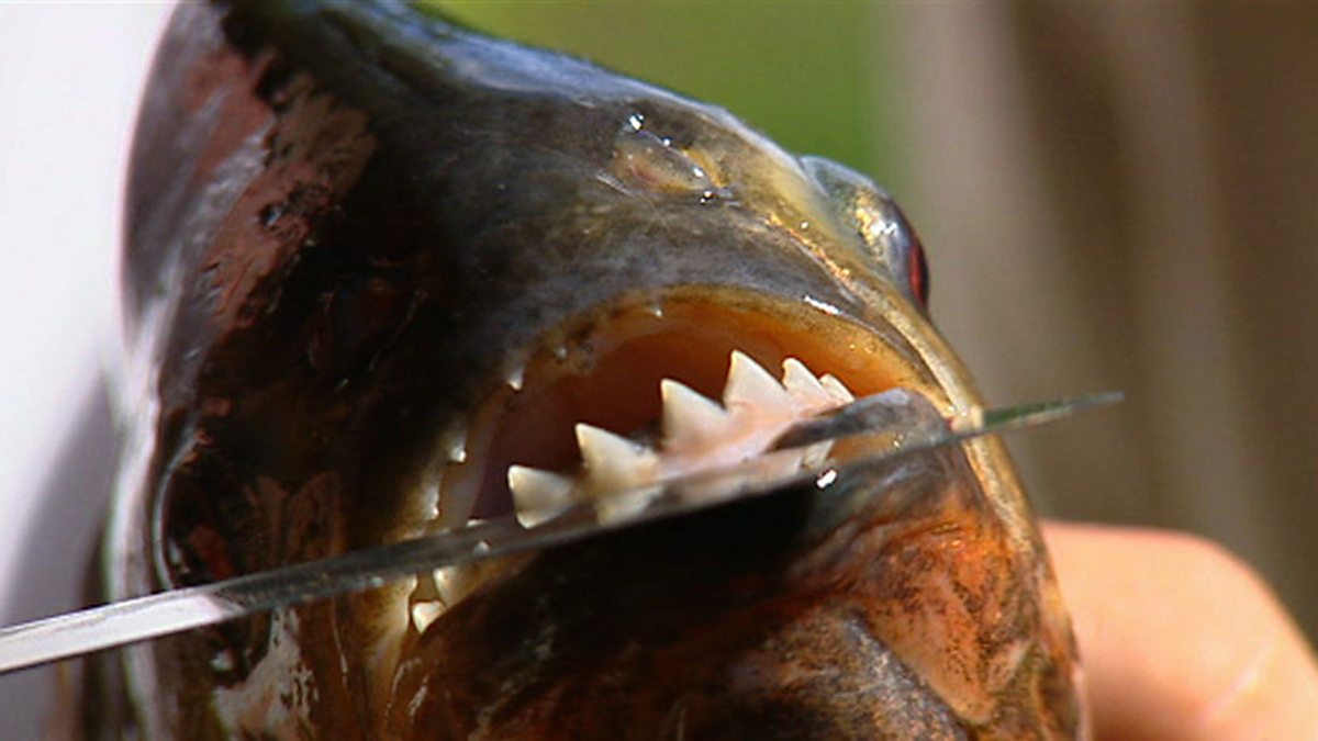 Steve Leonard pays a visit to a local market in Peru to buy a duck carcass before setting off to find one of the most feared animals on the planet. Piranhas believe in big numbers - really big numbers - there can be over 20,000 in a single shoal, all armed to the teeth and very, very hungry. But can piranhas really strip their victims to the bone in just minutes? Steve Leonard dangles the duck carcass in the water and makes it look as if the animal is struggling to break free of the surface with a broken wing or other bleeding injury. First, a small scout darts in to take a bite and checks how the prey reacts. If it gets a violent reaction, they all back off. But if not, then the whole pack just piles in. Just a few minutes later the duck is only tendons and bones. Picking up piranhas is like handling a cocked and loaded gun, with a hair trigger. The jaws are powerful enough to cut through metal. The average pack of piranha has a hunt success-rate of somewhere around 50%. But it only takes bites out of sick and injured prey, so it doesn't really count as proper pack hunting.