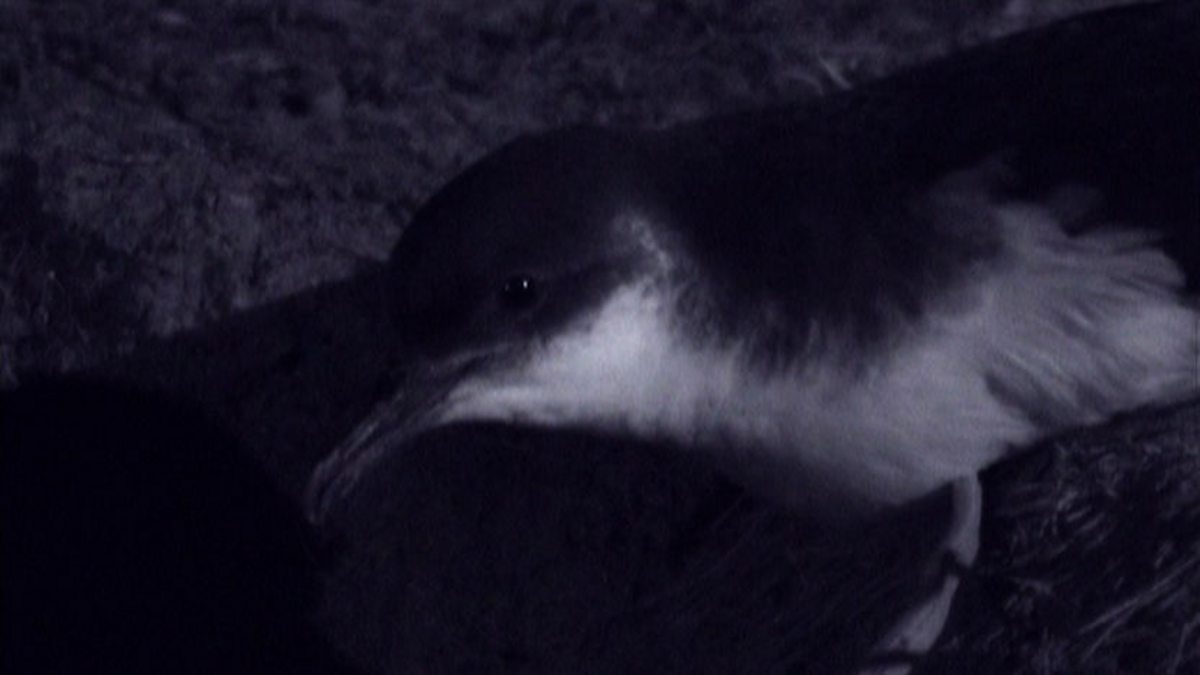 It’s half past nine, the sun’s set, and it really is getting incredibly dark, too dark now to use this camera, so we need to change to infrared and get out the image intensifying binoculars. But to begin with it’s more what you hear than what you see. Do you hear that? It’s been likened to the voices of cackling witches, I can believe that one. Somebody once said it was the ghosts of long dead pirates. It’s neither actually, it’s the sound of Skomer’s greatest treasure - and before long, they start to appear. Manx shearwaters, a quite remarkable bird. They’re not the most elegant birds on land… their legs are too near the backs of their bodies to get much balance or to be able to stand upright, but the shearwater’s designed for life at sea, it’ll just have come back now probably from a two day journey, fishing for sardines off the coast of Spain. Having eaten its fill it'll relieve its mate on the nest who will then go off and fish in turn. They come home at night to avoid being attacked by gulls. You can just make them out when your eyes get really accustomed to the dark. The place is beginning to be alive with them, and it’s not remotely scary, it’s quite wonderful. Just like the puffins, they’re here because of the rabbits – whose burrows attract 102,000 pairs of shearwaters each year – that’s a third of the world’s population on this one island. With so many neighbours in close proximity – the odd squabble is inevitable! These delightful birds pair up for life and may return to Skomer for anything up to 50 years.