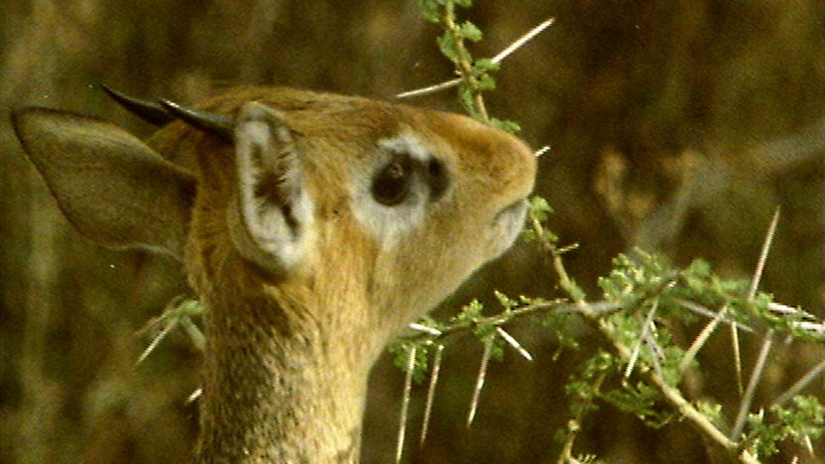 Before grass spread over the plans, the ancestors of grazing antelopes must have lived in bush country, rather as dik-dik do today. The bushes do not produce many leaves but they are highly nutritious and a single acre can sustain a pair of these tiny antelope. It is no surprise then that dik-diks mate for life and never leave their territory. They know it intimately and have their own trails and hiding places. They mark out their territory in the same way every time with the female starting by urinating on the ground. The buck then smells her, urinates, scratches the ground, and defecates. When the ceremony is over the buck marks a twig with a sticky perfumed wax from a gland just below his eyes. In comparison, impala eat grass and bushes in more open country. Because there is nowhere for them to hide, they find safety in numbers. Unable to live on their own territory, the males and females form separate herds and the bucks battle amongst themselves by clashing horns. The winners leave the bachelor herds and set up their own individual territories. The does visit them one after the other. But this period of mating and fighting off other males is very tiring, so after three months of it the males return to the bachelor herd to recover.