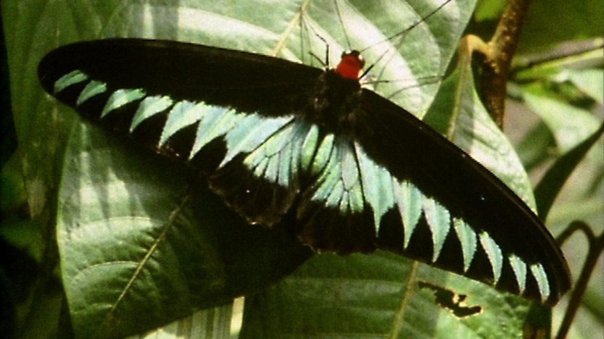 The rainforest canopy has an ecology of its own, a place where there is little breeze and where the leaves cut out most of the sunshine. Here each leaf is angled to catch the most light possible and many have a special joint at the base of their stem which allows them to twist towards the sun as it crosses overhead. Insects are everywhere, in myriad shapes and sizes. Some prey on others but most live off the trees, eating the seeds, sipping the nectar, sucking the sap and munching the leaves. Weaver ants use the leaves as walls for their nests, using the colony's grubs as tubes of glue, gently squeezing them to produce threads of sticky silk which they use to bond the leaves together. Eventually they produce an enclosed globe within which they can rear their young. Monkeys like the South American squirrel monkey spend much of their time in the canopy in search of leaves, shoots and buds.