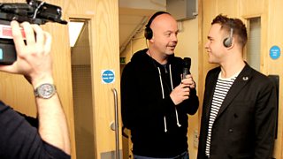 Olly Murs gets a grand tour of radio 1 studio toilets by Dom. (There is a slight delay with Chris in the studio).