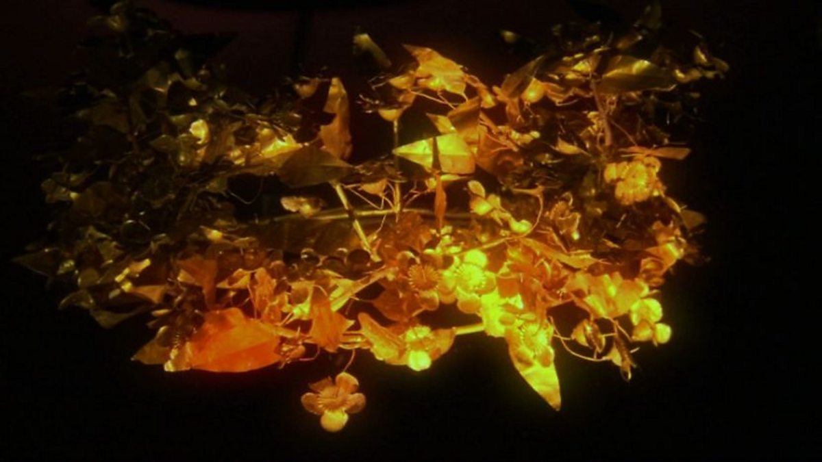 Dr Michael Scott examines the golden wreath of Queen Meda of Macedon in Northern Greece, two and a half thousand years old, from an exhibition in the Ashmolean Museum, Oxford.