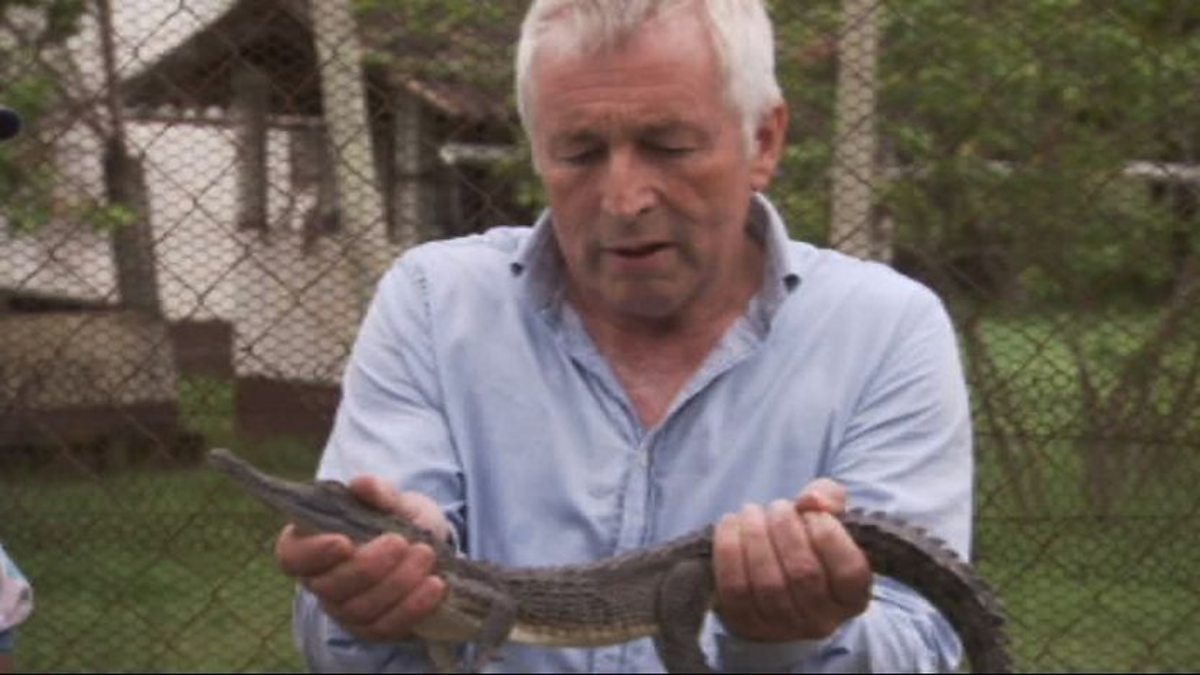 Jonathan Dimbleby visits the Hato Masaguaral, a ranch in the plains of Venezuela that breeds an endangered species of crocodile commonly know as the Orinoco Caiman. Jonathan happily strokes a 3 day old caiman but the larger ones prove to be more challenging. The breeding males live in cages on their own and can grow up to 6 metres long. Killed for fun or for their skins, this crocodile only exists in Colombia and Venezuela. It is critically endangered which is the highest risk category for wild species. This means it's numbers will decrease by 80% within 3 generations.