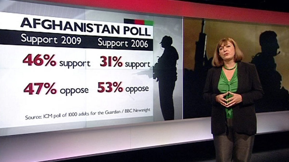 In the studio, there is analysis of a Guardian/BBC Newsnight public opinion poll sampling 1000 people on various aspects of the war in Afghanistan.