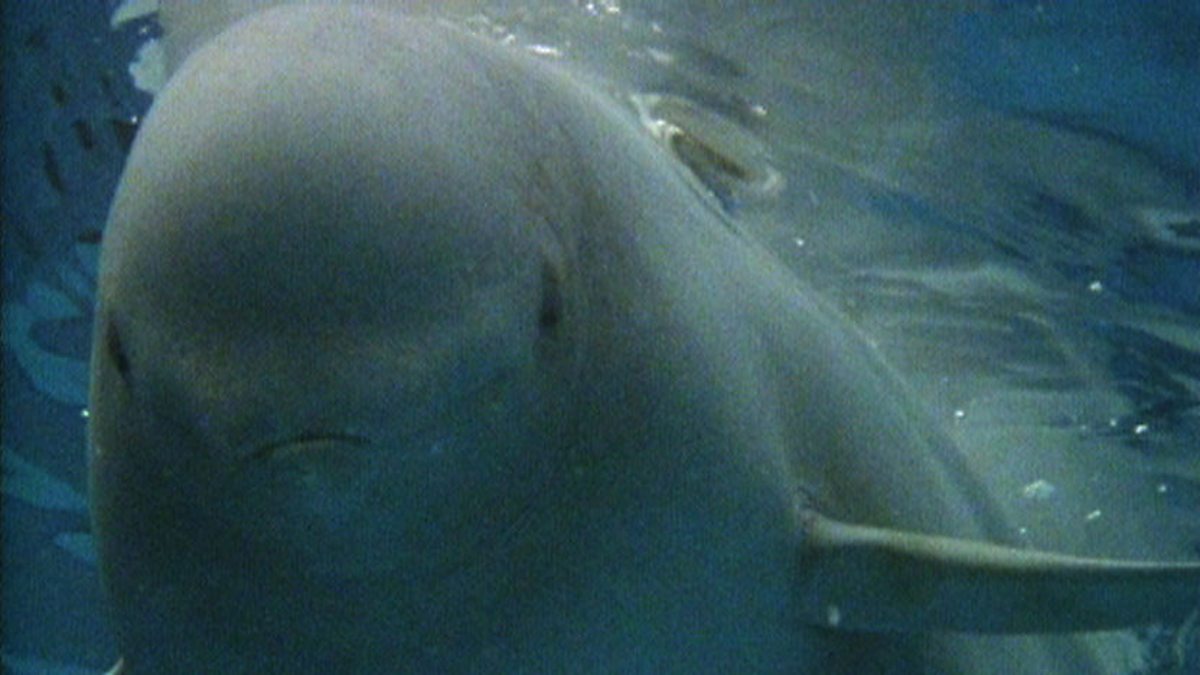 In the Canadian Arctic beluga whales gather in the few weeks when the ice leaves the shores. At this time, they assemble in vast numbers, sometimes up to a thousand at once. No one knows exactly why they come to this particular area. It may be because there is a particular food that they find in these shallow waters since they sometimes seem to deliberately stir up the gravelly bottom of the bay. Many who come are females with babies that are only a few months old swimming swiftly in their mothers' slipstreams. Belugas are nicknamed sea canaries because of the sounds they make. A young one twirls round and round in play.