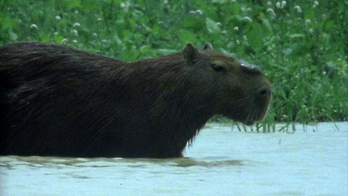 The Amazon has no great lakes on its course so even in its middle stretches it still carries mud from the Andes. Yet the Rio Negro which joins it is clear because it comes from the north-west where the rocks are hard and bare. The two rivers flow alongside one another in the same bed, scarcely mixing. As well as sediment they also carry a lot of nutrients, so life on their banks flourishes. Herds of capybara wade through the shallows cropping the plants. With webbed toes, they are well adapted to swimming. They also have their eyes, ears and nose at the top of their heads, making it easier for them to see, hear and smell while remaining mostly submerged. Giant otters have a similar head design but often lift themselves out of the water to get a better view of their surroundings. At six feet long, Amazonian otters are the biggest and best swimmers of all the world's otters. They have large webbed feet, a flattened tail and sensitive whiskers. Pairs lay claim to a stretch of river by making territorial patches on the bank and marking them with their own smell.