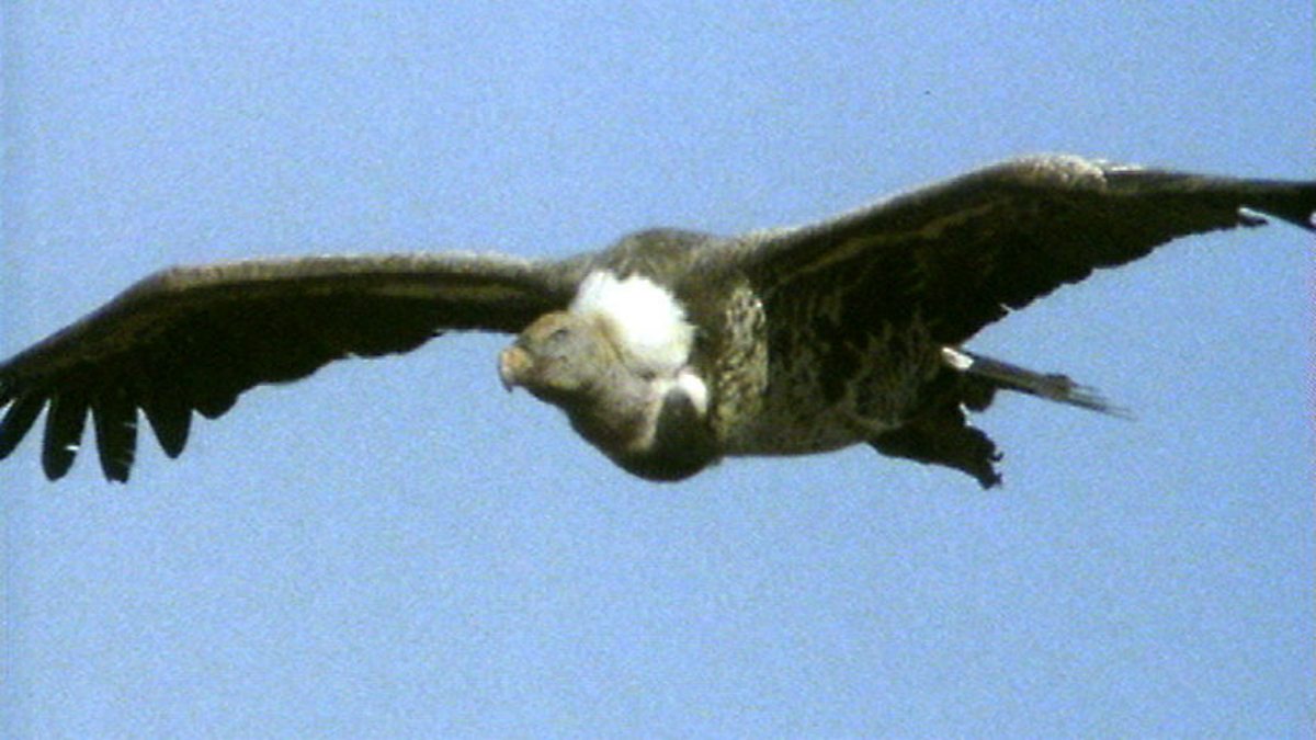 David Attenborough goes on a hot air balloon flight over the Serengeti. The balloon uses hot air to give it lift and rise into the sky. In the same way, the land is heated by the sun. But some parts of the land absorb heat while other parts of the land will reflect the heat, creating uprising columns of air called thermals. Vultures have large unwieldy wings that take a lot of energy to use. So in the mornings they simply use their wings to get from one low tree to another. But when the land has heated up later in the day, then there are thermals to ride. They use the thermals to provide them with an observation post high in the sky so that they can scan the planes below. From his vantage point David is able to see a herd of wildebeest, perhaps the largest gathering of meat on the hoof in the world. Soaruing vultures can quickly spot a kill or deduce its presence by the behaviour of birds in a neighbouring thermal. Once one bird has found the carcass of a wildebeest calf, dozens will arrive within a few minutes. Most of the ones that turn up in this instance are medium-sized vultures - Ruppell's Griffon and white-backed - but amongst them is the largest and most powerful of the African vultures: the lappet-faced vulture. Heavy with meat, they will not fly far - only back to the perch or nest where they can digest.