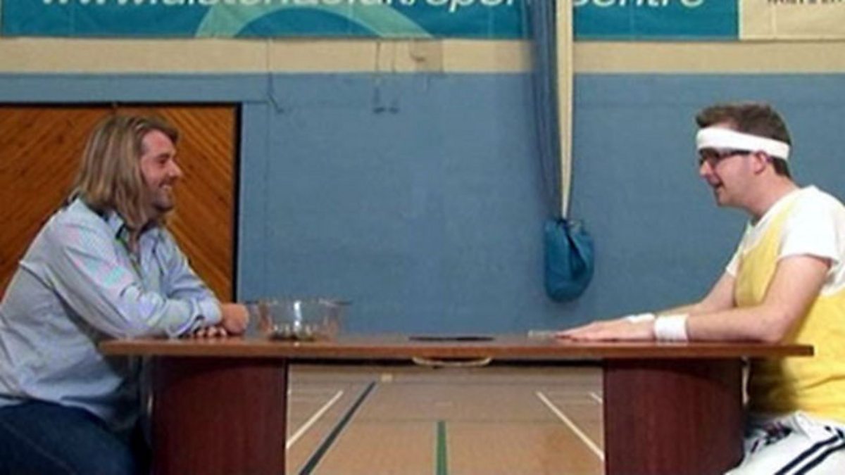 Mentalist David Meade encourages a member of the public to take part in a game of tiddlywinks with him.