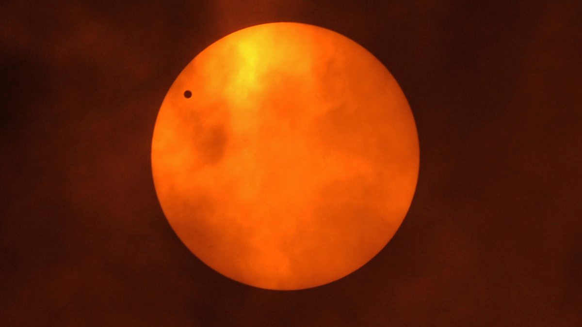 (Image: Venus (black dot) is silhouetted as it orbits between the Sun and the Earth during the transit of Venus seen from Bangkok on 6 June 6 2012. Credit: AFP/Getty Images)