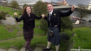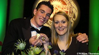 Kirsteen a' seinn air an àrd ùrlar agus a h-athair a dèanamh ruidhle aig cùl a thalla.